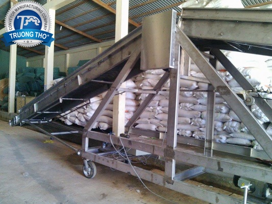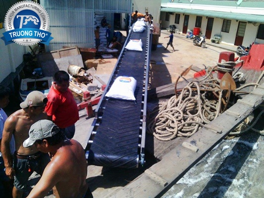 Băng tải được thiết kế 2 băng tải cao su nâng hạ dài 9 mét và 6 mét theo dạng cánh bướm hay còn gọi là băng tải cầu cảng