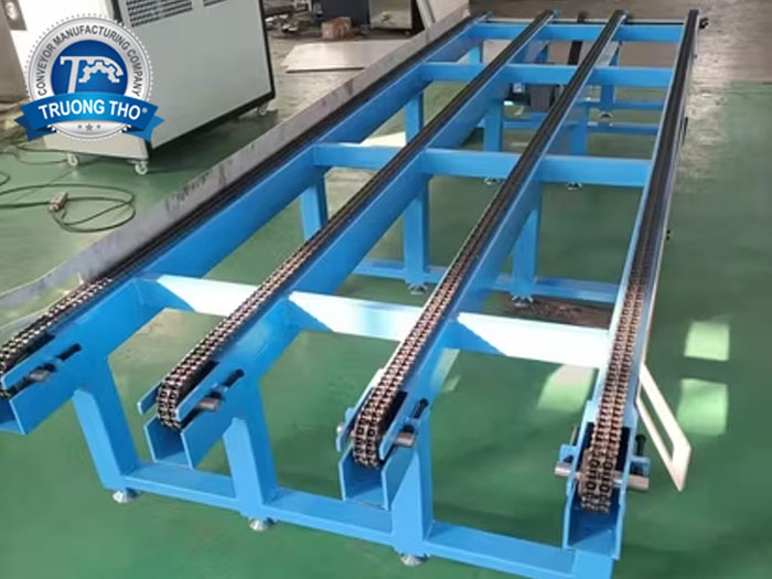 Băng tải dạng chuỗi xích là hệ thống vận chuyển sử dụng các xích liên kết với nhau bằng móc và đinh tán, hoạt động nhờ động cơ để di chuyển vật liệu. Với khả năng chịu tải nặng và độ bền cao, hệ thống đảm bảo vận hành ổn định và chính xác. Chúng được sử dụng trong các ngành công nghiệp nặng và dây chuyền sản xuất, nơi yêu cầu vận chuyển vật liệu có trọng lượng lớn và điều kiện làm việc khắc nghiệt.